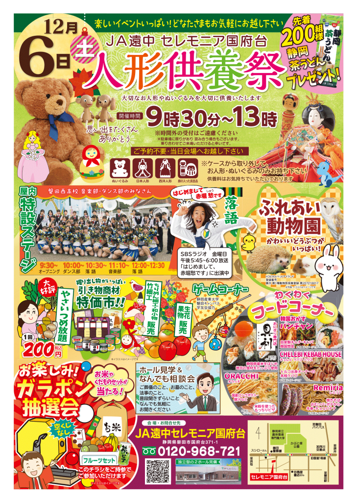 JA葬祭センター磐田主催12月6日(土) 9時30分から13時まで 人形供養祭を開催いたします。同時に、やさい詰め放題・ふれあい動物園・引物特価市や抽選会も行います。